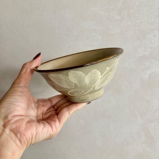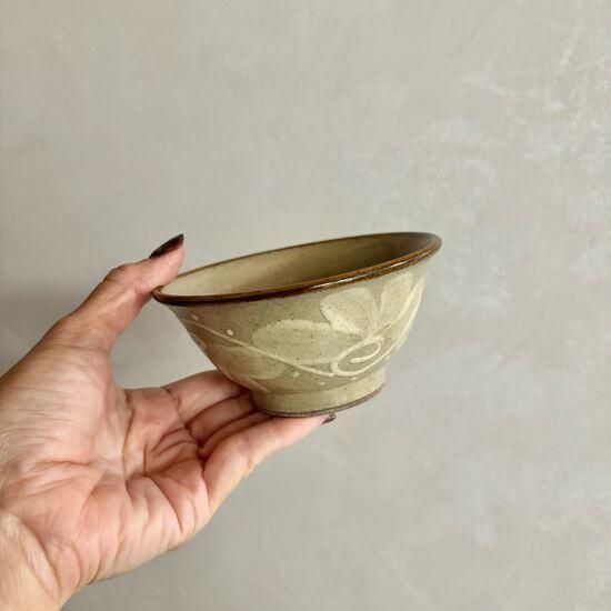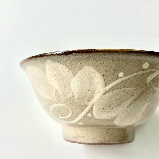 ふわっと描かれたクリーム色の唐草がうつわを彩り、